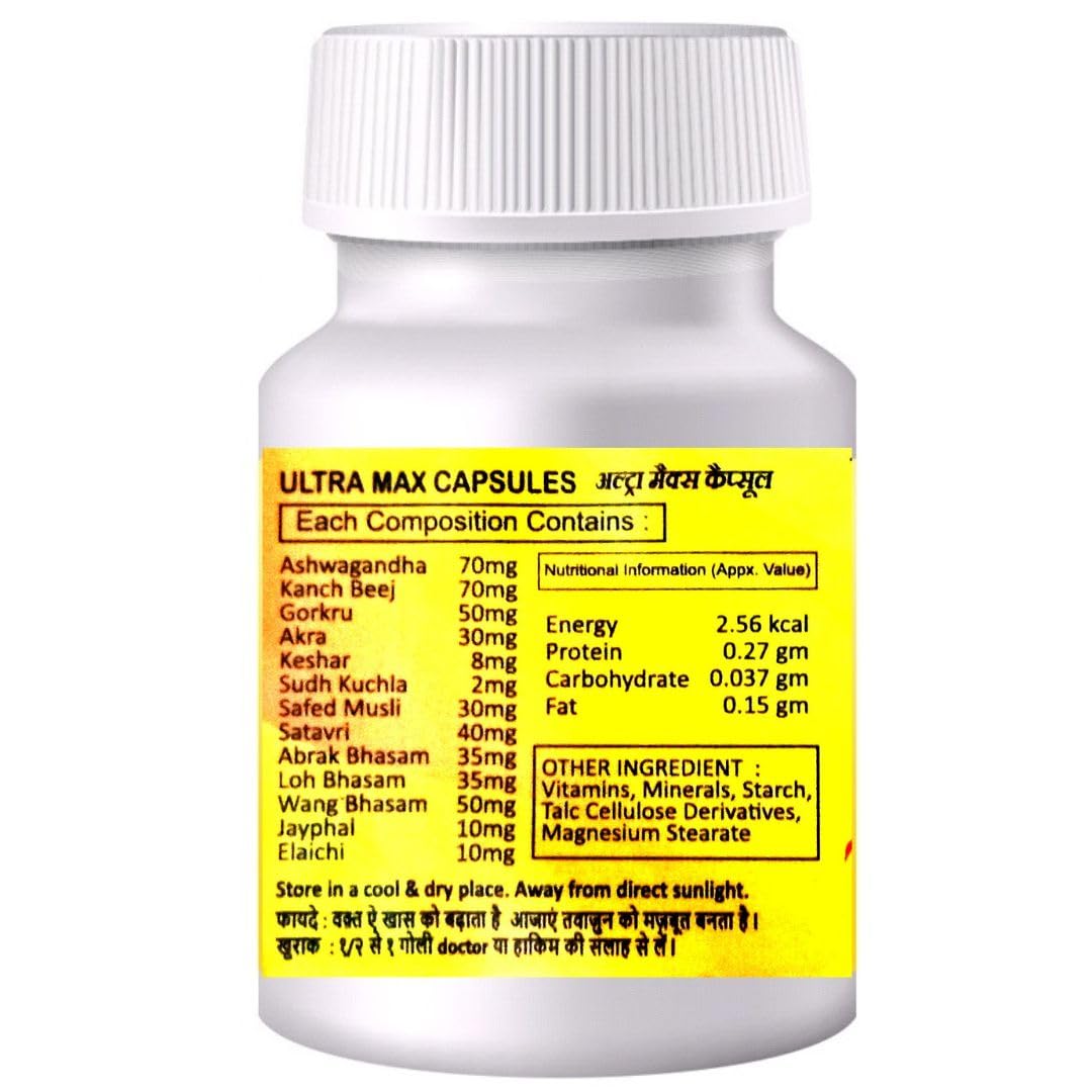 “Ultra Max Capsule” is typically marketed as an Ayurvedic or herbal supplement formulated for men to enhance overall health, vitality, and performance. The goal of these formulations is generally to combine traditional herbs known for their properties to boost energy, stamina, and support male reproductive health.